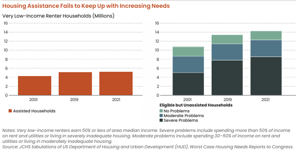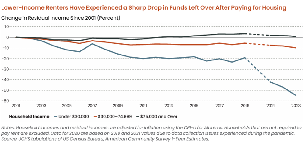 Harvard also noted the need for expansion of subsidy programs for renters to improve their efficacy, as rent costs continue to rise, and new construction targets the higher end of the rental market. Trends in Harvard’s report show the increase in cost-burdened renters between 2019 and 2023 nationwide as going from 20.4 million to 22.6 million, while the number of severely cost-burdened renter households hit a record high at 12.1 million in 2022 and stayed steady in 2023. These increasing figures create the ever more urgent need for moderately-priced rental housing. Moderate-income renter households, or those earning between $45,000 and $74,999 in annual income, have experienced the fastest growth in renter households becoming cost-burdened, with their rates doubling to more than 45 percent from 2001 to 2023. This income group also saw their residual income, or income left over after housing costs, fall by 10 percent since 2001; renters with household incomes below $30,000 had a median residual income of $250 per month, which is an average 55 percent decrease since 2001. Per NLIHC’s report, “The Gap,” of the 10.9 million renters with extremely low-incomes, there are only 3.8 million units available and affordable to those households, leaving only 35 rental homes available and affordable to every 100 extremely low-income renter households. These estimates are also conservative, as they are based on surveys conducted using addresses; the shortage of 7.1 million homes for extremely low-income households is therefore an underestimate, as it does not include homeless households.