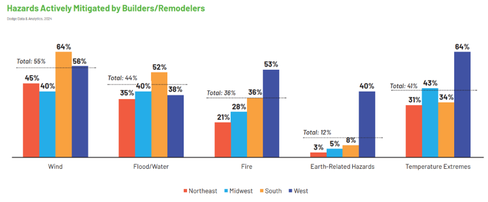 From the National Association of Home Builders’ Green and Resilient Single-Family Homes 2024 SmartMarket Brief, the graphic below lists the most common hazards encountered in each region throughout the United States. The states within the Fifth District are included in the data points for the South and Midwest, whose most frequent mitigation and repair efforts by home builders and remodelers are caused by damages due to wind, flooding, and temperature extremes. However, as was demonstrated in Eastern Tennessee from Hurricane Helene, disasters and extreme weather that were not previously considered common in the Fifth District are beginning to make unprecedented appearances and cause severe damage to the communities that they touch.