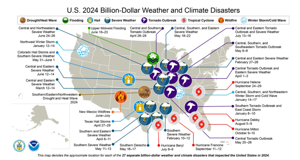 The need for funding for repairs and improvements for the existing housing supply, including but not limited to climate readiness, in order to mitigate and minimalize the effects of climate change is cited in both “The Gap” report and by Harvard. A record high number of billion-dollar weather and climate disasters occurred in 2023, with 28 hitting the U.S. In 2024, 27 events totaling at least $182.7 billion led to the fourth costliest year on record for climate disasters, according to the National Oceanic and Atmospheric Administration (NOAA.). It is predicted that 61 million homes within the United States are within areas categorized to have at least moderate predicted loss in future disasters. Within the Fifth District, these areas are primarily in Tennessee, with a moderate amount in Kentucky and a few in Ohio. The number of billion-dollar climatic events in 2024 are depicted by region and type of event in the map below. In 2024, the majority of the billion-dollar climatic events were severe weather, followed by tornadoes, both of which occur in the Fifth District. There have also been several other events across the nation and in the Fifth District that have resulted in severe destruction and financial loss that are not accounted for in the numbers previously mentioned, as their total costs registered less than $1 billion for the single event, or because the totality of the damage is still being assessed.